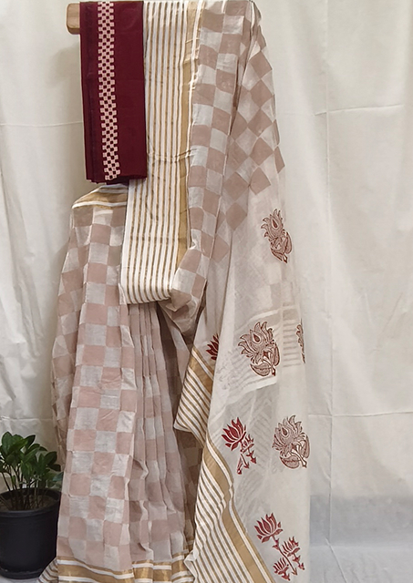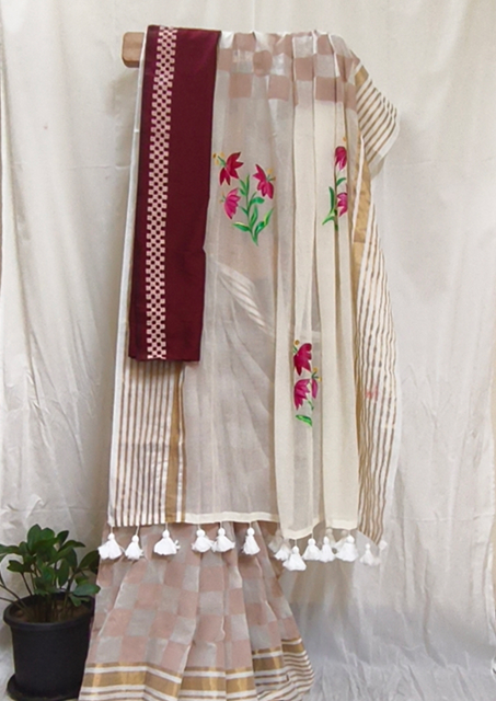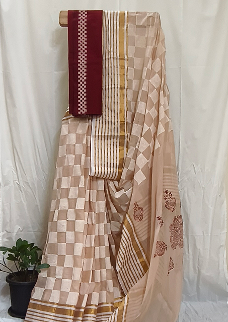 Fabric: Mulmul cotton 120 count, sandal with offwhite checks and maroon Kathakali and Om pattern in pallu