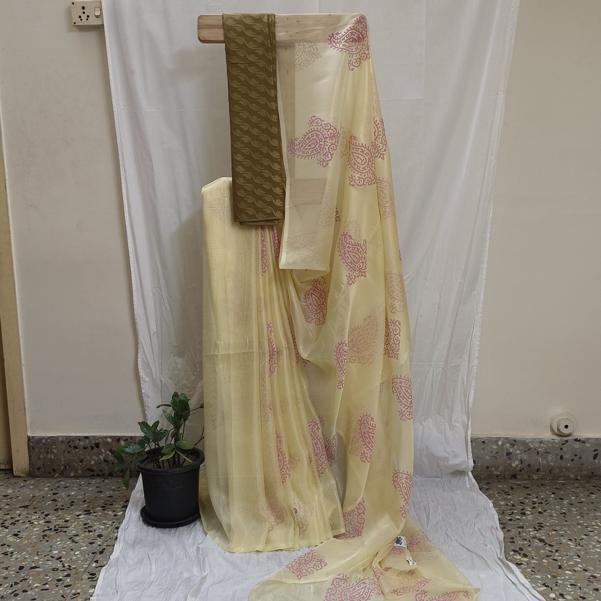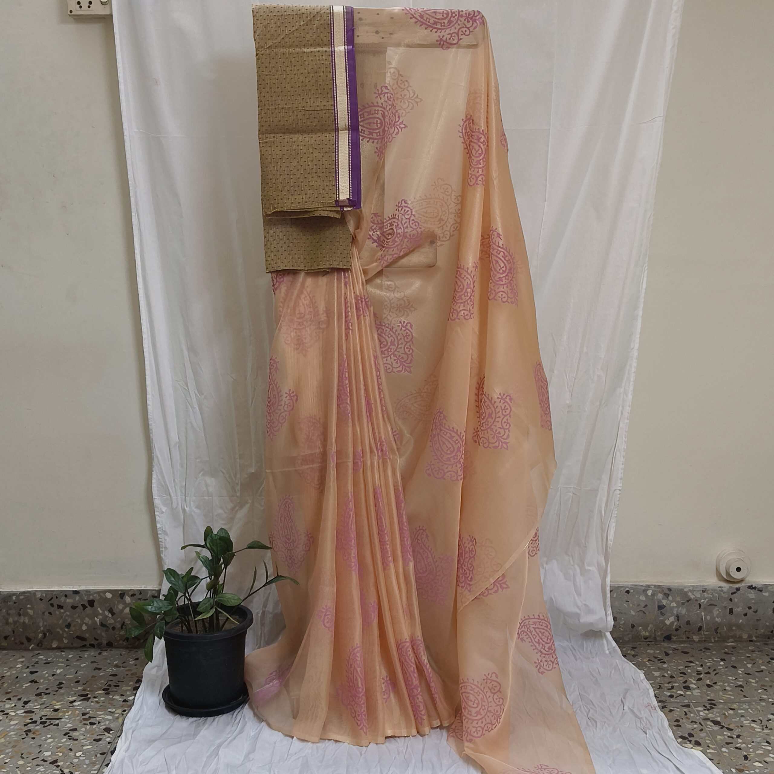 Hand block printed in three pastel hues — golden, yellow, and peach — each motif rests gently on the airy fabric, creating a play of light and craft that feels almost ethereal. Perfect for daytime celebrations, intimate gatherings, or that golden hour moment, this saree captures the charm of handcrafted artistry with a contemporary pastel twist.