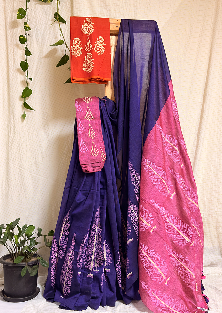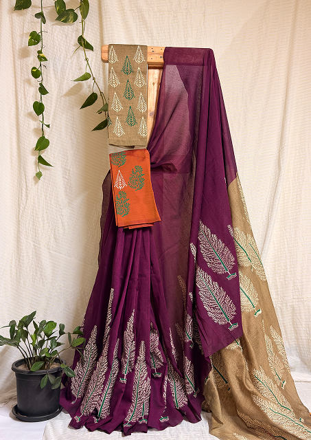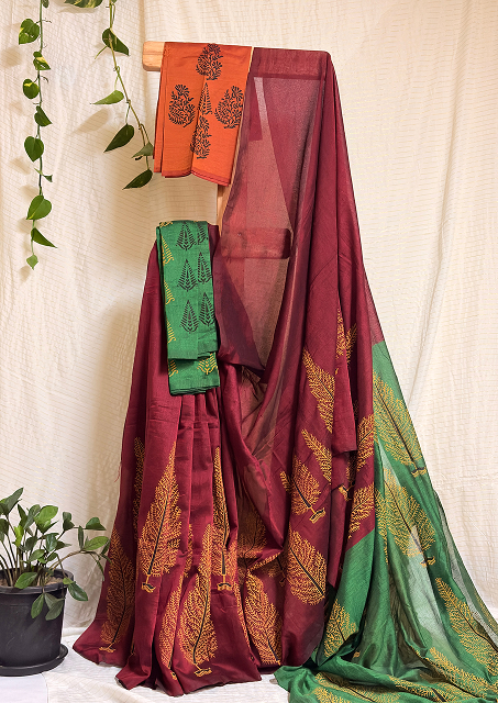 Step into a world where art and nature meet. Whispers of the Forest is a hand block printed saree that brings to life the tranquil beauty of tall, slender trees – their canopies stretching high like a silent jungle dreaming in green. Each tree is printed by hand, using traditional wooden blocks, capturing the rhythm and stillness of a